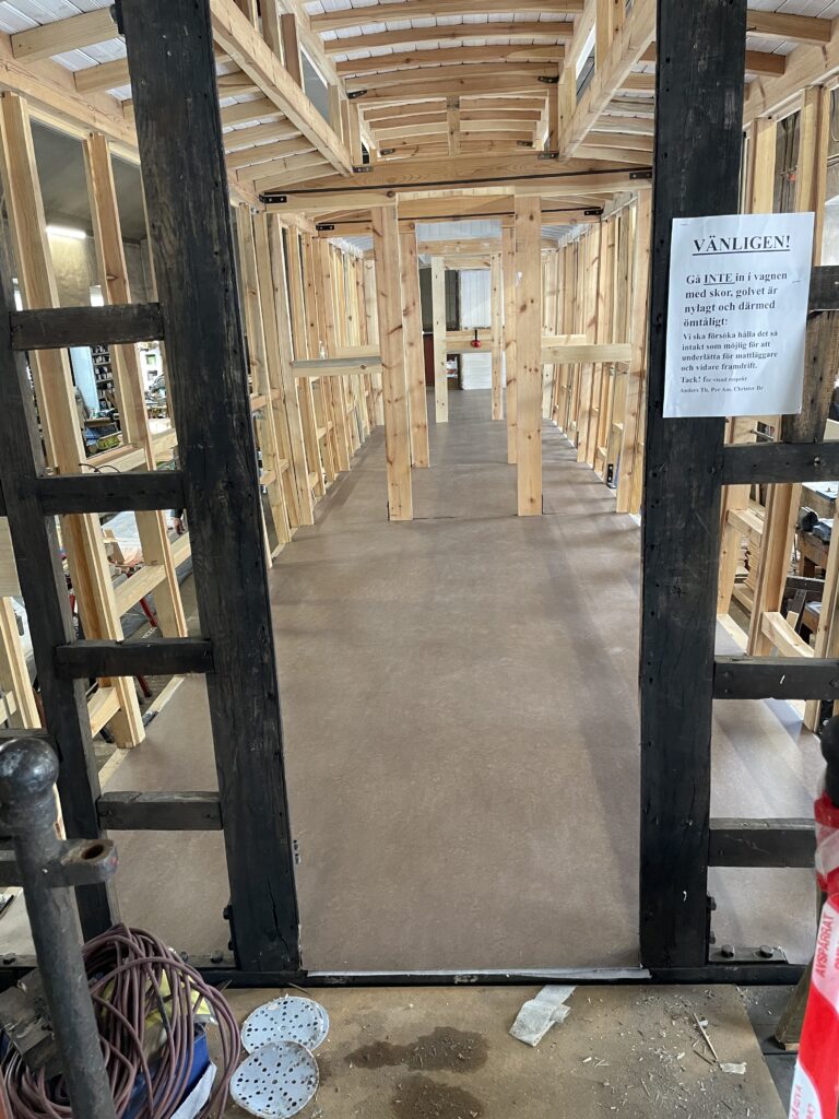 Återuppbyggnaden av vagnskorgen på den kombinerade person- och postvagnen Norra Hälsinglands Järnväg (NHJ) BCDo nr 1, har nu avancerat så långt att alla sidostolpar med tillhörande tvärstag på plats. Sista delen av topplisten, som även ska bära upp taket på plattformen, ska göras klar och monteras. På ”taket” är halva lanterninen nu på plats.