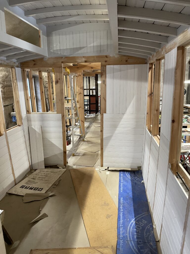 Golvmattan är nu inlagd och monteringen av väggpaneler har påbörjats.
